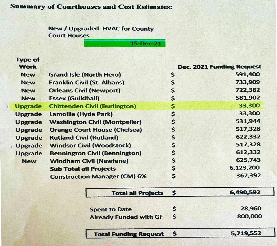 Duct and coil cleaning recommended by the State will be done in two phases, the first in FY ending in January 2022, and the second FY ending in January 2023. This work has already been started, and has been done during the hours that court is not in session. This work will cost $33,300. The State has applied to the legislature to appropriate $5,719,552.00 to upgrade the air quality in the State’s 12 County-owned courthouses. We at Chittenden County Courthouse are very proud to have always been proactive in keeping the courthouse, and it’s air quality up to date. Bringing the Chittenden County Courthouse up to full-Covid compliance will cost much less than in other counties.